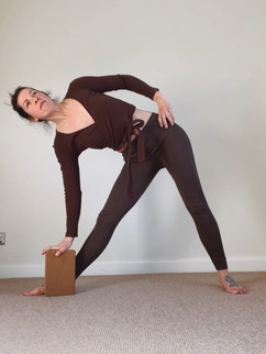 3. Rest the left hand on the left thigh, shin, floor or a block. The chest is still open to the right hand side of the room, encourage the left lung and heart up towards the ceiling. Draw the core in, hug the lower ribs to extend the waist and lower back. Find energy as you firm the feet down.